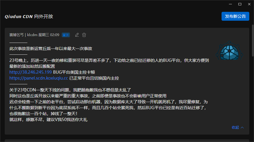 可新平台也没顺顺当当的,刚上线就出了严重事故,直接掉线一整天。这一下,刚切到新平台的上百个站点全受了影响,这儿真得说声万分抱歉。