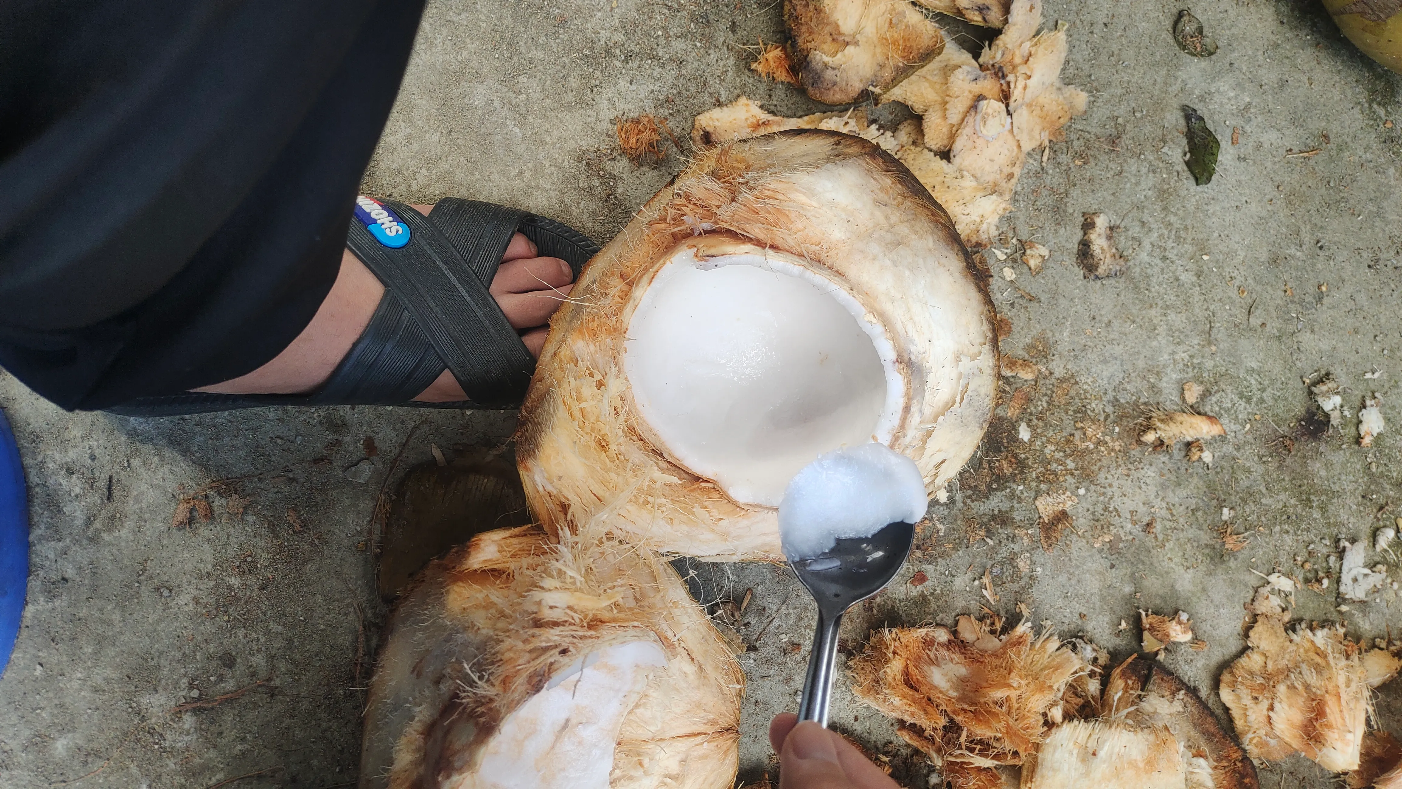 海南的椰子是超级好吃的好吧,这里面的椰子肉超级嫩,依照我妈从小到大的吃饭就是把它椰子肉完整弄下来然后就沾点白糖吃,试了试,超级好吃,椰子水也很甜,不过感觉在喝酒似的